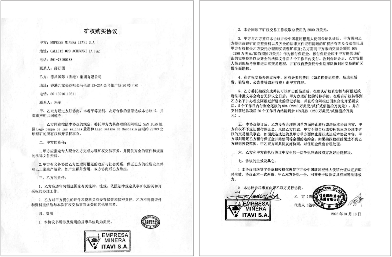 2023年1月17日我香港德昌公司代表与阿根廷Empress Minera ltavi S.A公司正式签署了锂矿矿权转让协议书。可开发资源面积达22789公顷,资源量约数百万吨碳酸锂的储存量。首期投资金额为5-6亿美金,年产5万吨碳酸锂,产值约40亿美元折合人民币250亿。